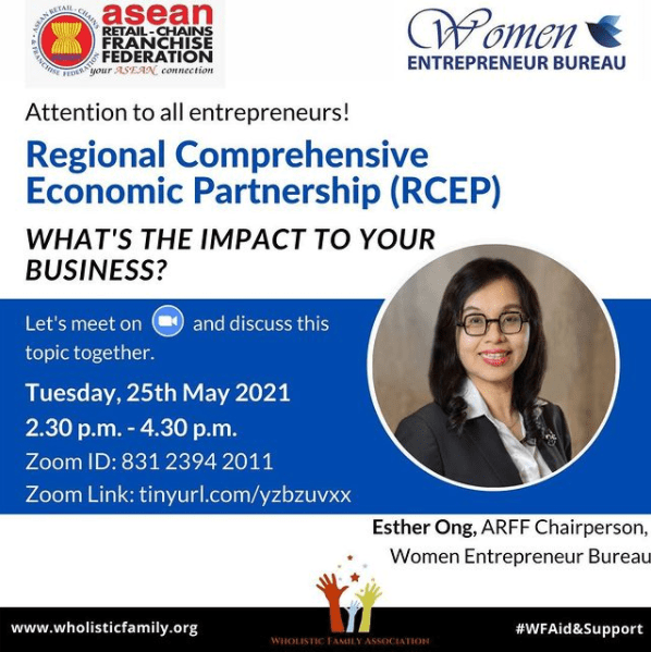 The speaker, Ms Esther Ong as the chairperson of the Women Entrepreneur Bureau, informed participants about the Regional Comprehensive Economic Partnership (RCEP) that serves as an important agreement between the ASEAN countries to protect our market.